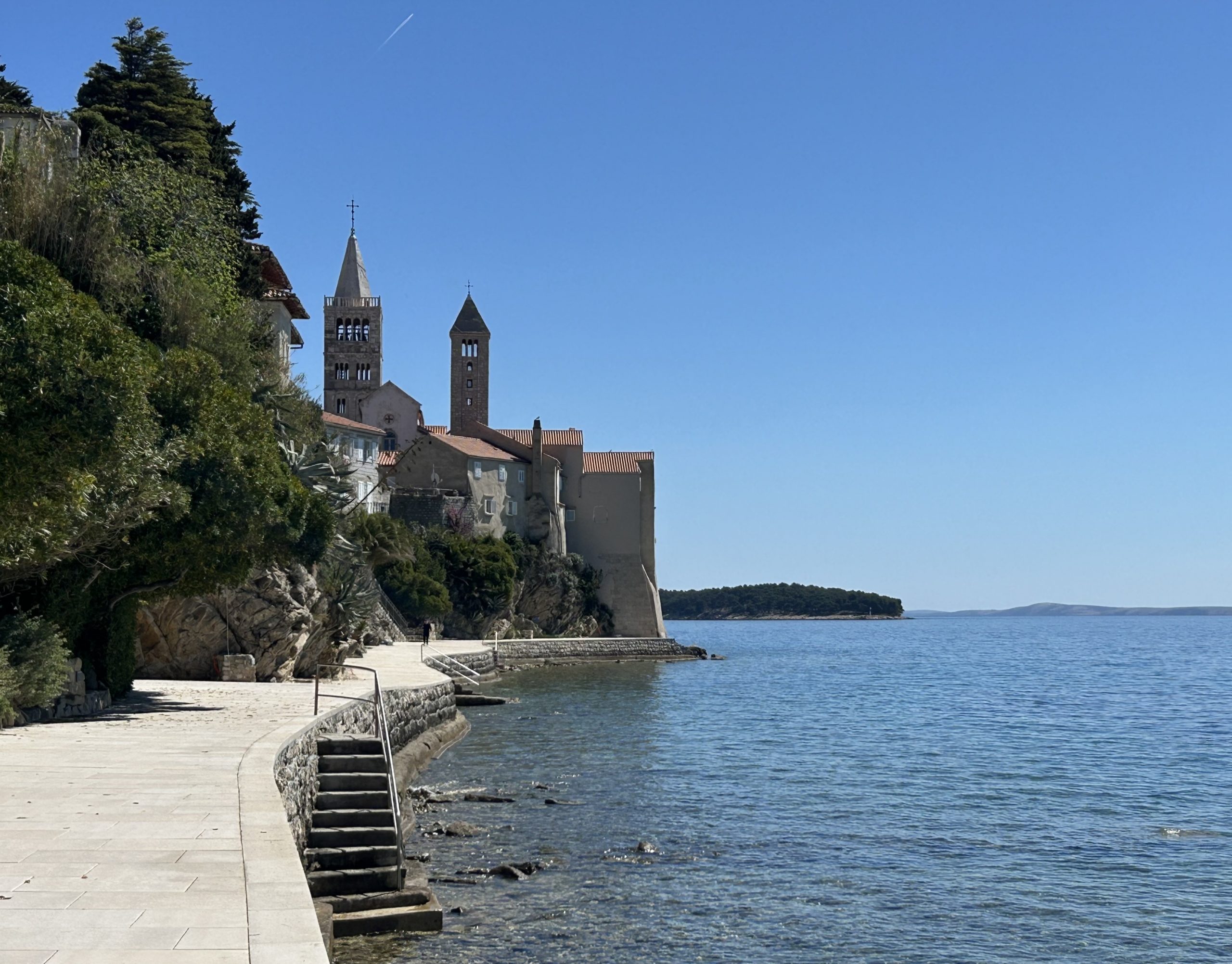 When we reached Rab, it felt like a reward. It’s one of the most picturesque places we’ve seen. Four clock towers rising above the old town, a castle backdrop, blooming parks, and impossibly clear water. We slowed down, took a breath, and allowed ourselves to chill.